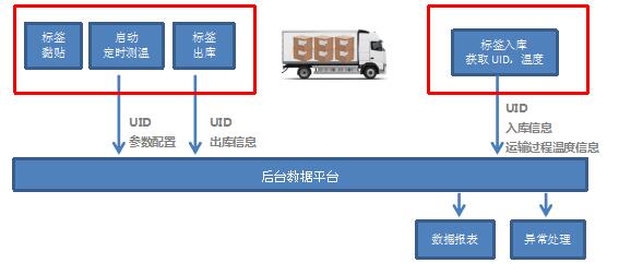 二,出發(fā)前,把測溫標(biāo)簽粘貼在需要運輸物品的包裝上,在運輸車輛內(nèi)安裝溫度監(jiān)控系統(tǒng),溫度監(jiān)控系統(tǒng)按照設(shè)定的參數(shù)定時向標(biāo)簽發(fā)送信號,讀取溫度數(shù)據(jù)并可通過無線網(wǎng)絡(luò)把數(shù)據(jù)實時傳送到后臺系統(tǒng),管理人員可通過后臺數(shù)據(jù)實時監(jiān)控運輸過程的溫度變化,并可實現(xiàn)預(yù)警管理。此方案在有源和無源模式下均可實現(xiàn)。