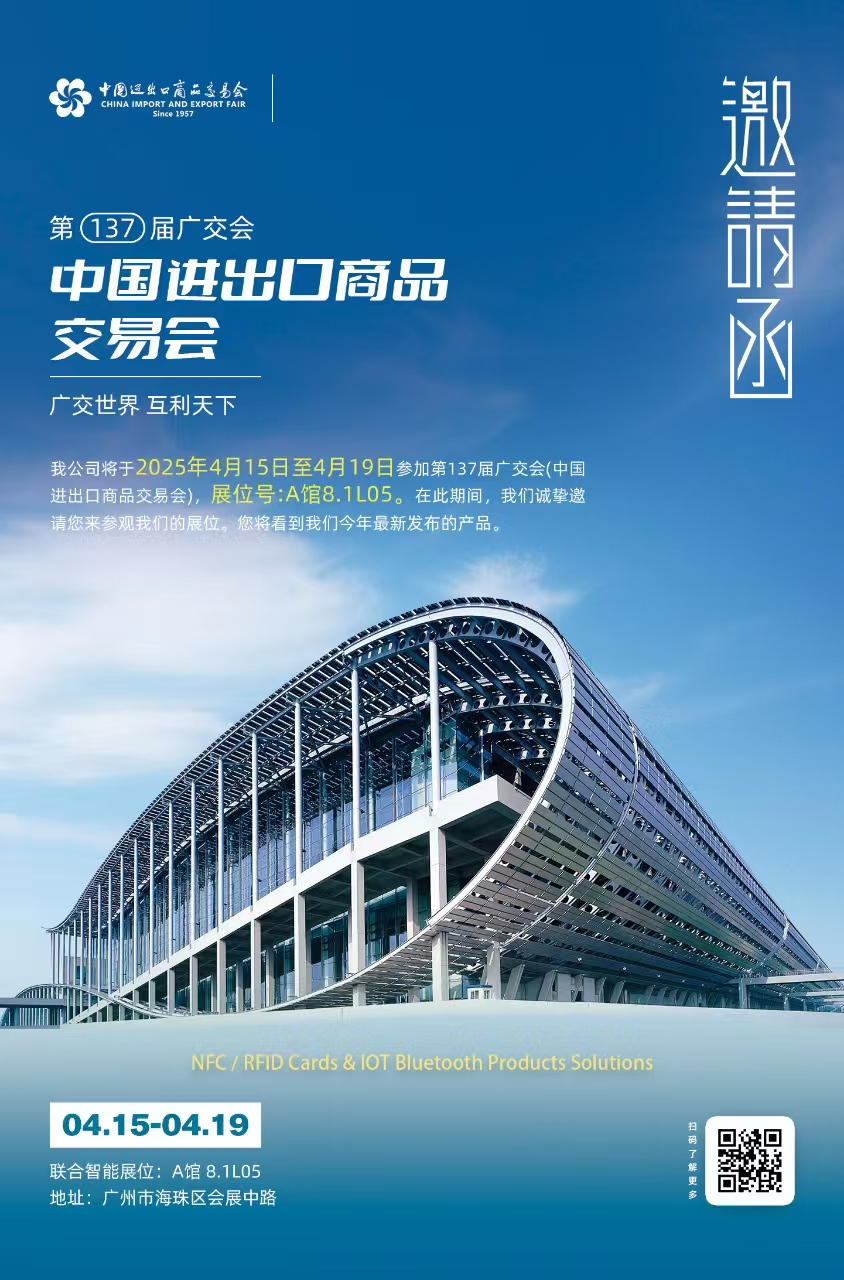 4 月 15 日 - 19 日,廣東省聯(lián)和智能科技有限公司將攜年度創(chuàng)新成果登陸第 137 屆廣交會(展位號:A 館 8.1L05),以 "智能連接世界,創(chuàng)新驅動未來" 為主題,重磅展出findmy card、藍牙卡、防丟器、NFC 卡、屏蔽卡五大明星產(chǎn)品,為全球客戶呈現(xiàn)物聯(lián)網(wǎng)時代的智能生活解決方案。